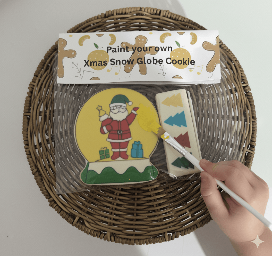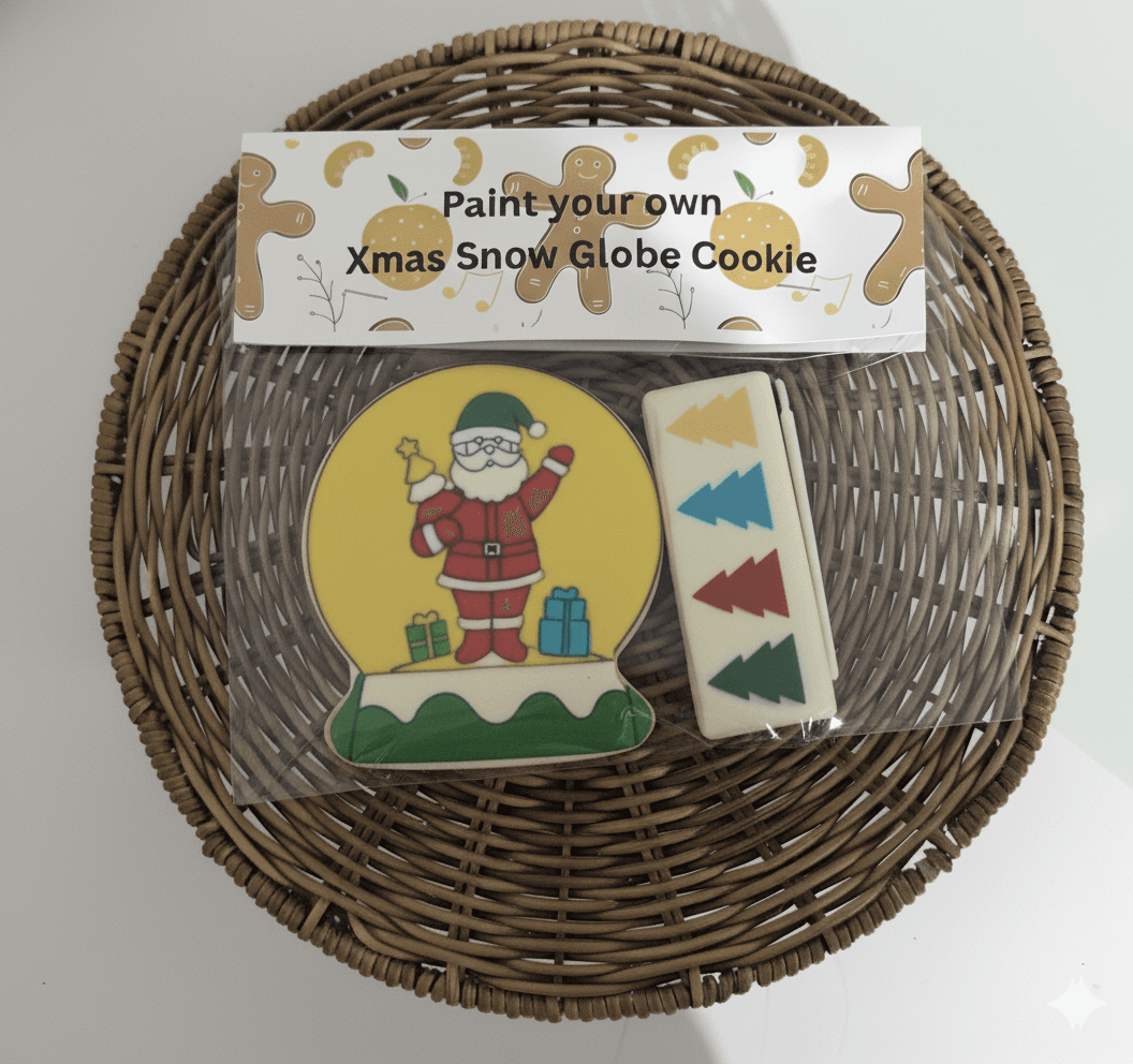 Paint your own Santa Snow Globe cookie. Food-safe paint brush, dip the brush in water, then use the edible paint pallet to paint the cookie.